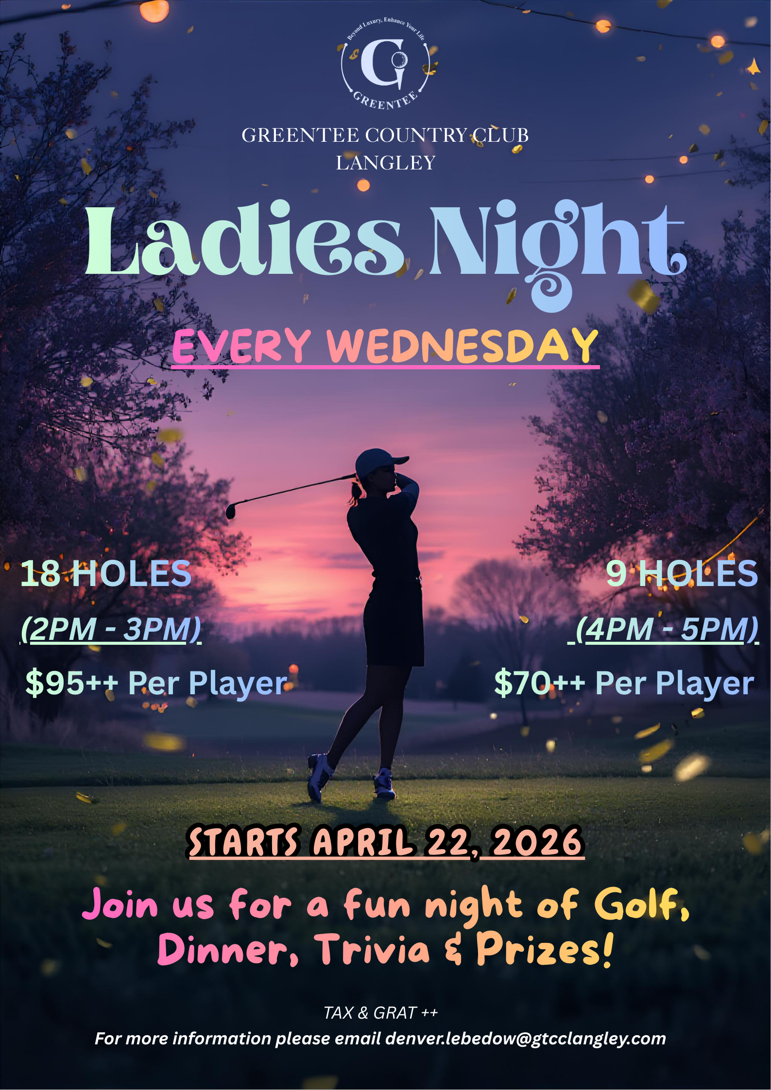 Join the GreenTee Ladies Night on Wednesday Nights, tee times starting at 2pm for a peaceful and relaxing course atmosphere, fun competition, and great prizes!